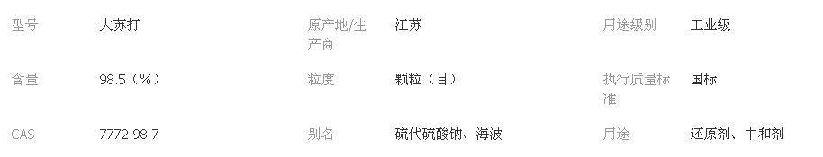 硫代硫酸鈉,又名大蘇打、海波、次亞硫酸鈉。為單斜晶系白色結(jié)晶粉末,易溶于水,不溶于醇。用于分析試劑等,用途非常廣泛。
