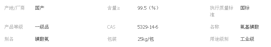 性 質(zhì):白色正交晶體;不揮發(fā)、不吸潮、無味無臭;常溫時(shí)很穩(wěn)定,能保持?jǐn)?shù)年不變;易溶于水和液氨,在水溶液中呈強(qiáng)酸性;微溶于甲醇;不溶于乙醇和乙醚。具有氨基和磺酸基雙官能團(tuán),能和多種物質(zhì)進(jìn)行化學(xué)反應(yīng)。熔點(diǎn)205℃,分解溫度209℃。